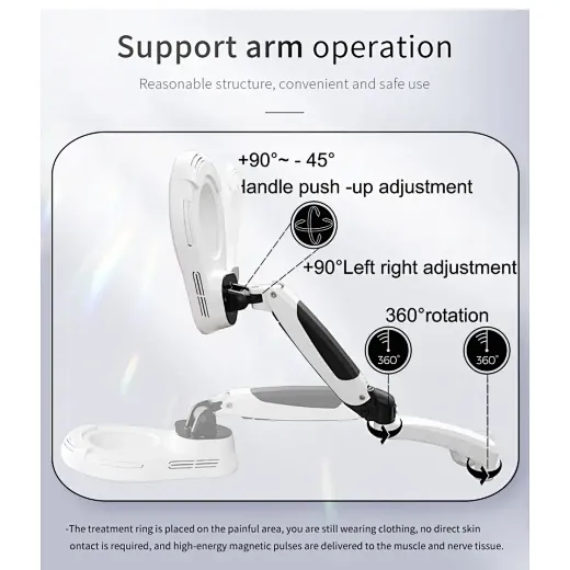 Holding arm for fatigue-free work The physio magneto works by placing the magneto applicator over the area which requires treatment. High frequency magnetic impulses are then transmitted directly into the affected
